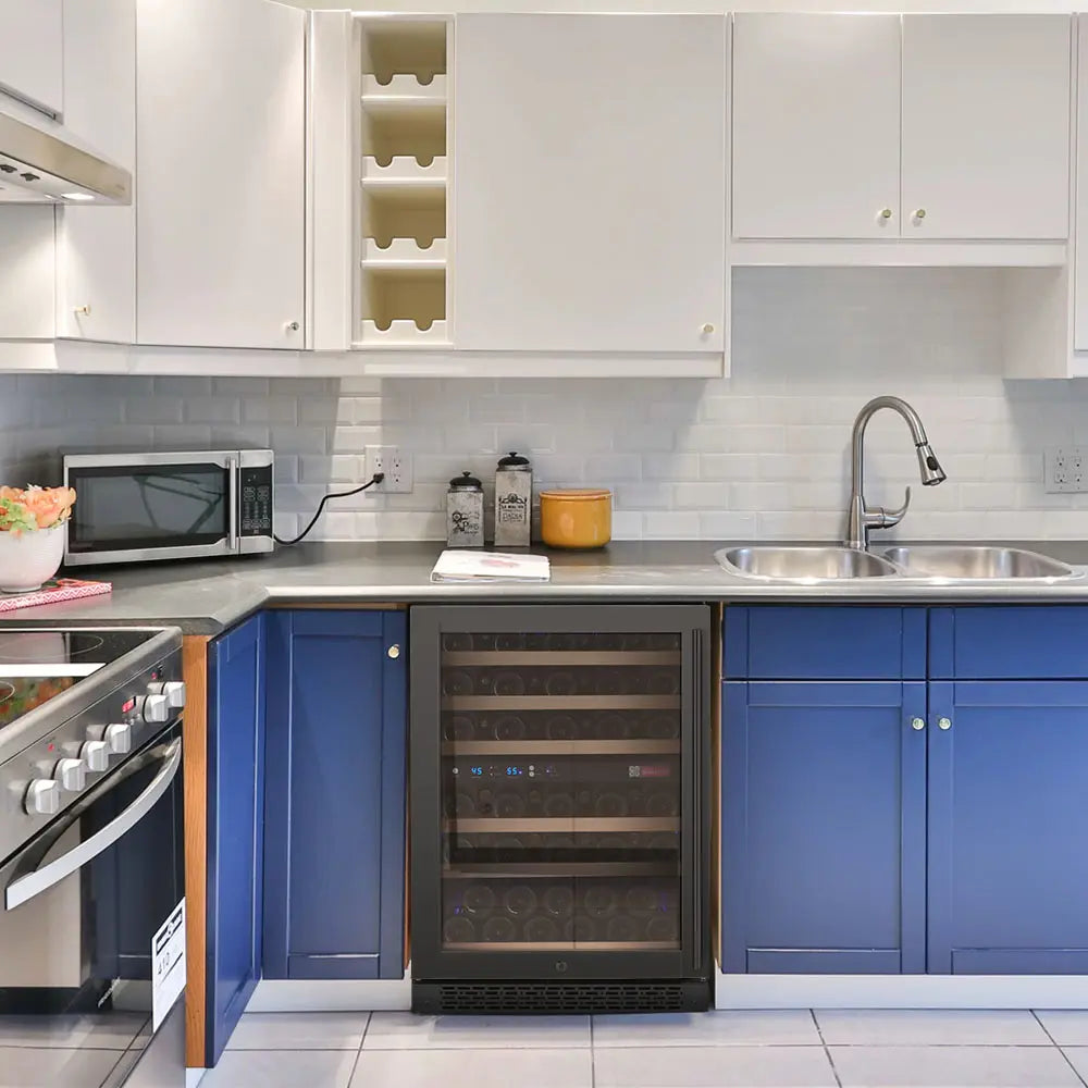 The Allavino FlexCount II Series VSWR56-2BL20 Dual Zone Wine Refrigerator with Tru-Vino Temperature Control Technology makes it easy to store up to 56 wine bottles of various sizes, and can be used as a stylish freestanding unit or built into your cabinetry for seamless wine storage.